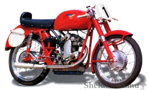 It was not difficult to produce a 100 cc derived from the 75 cc racer that delivered 11 hp at 10,500 rpm with a 20 mm carburettor. From this engine also a dohc version was created which achieved 11,500 rpm. On the first of January 1955 Orlando Ghiro and Vittorio Zito broke 14 world records in both classes. Also 125 cc and 175 cc racing bikes were built - the 125 developed 13 hp at 10,000 rpm and about twenty were produced, and ten of the 175 cc racers were created. These were built in the FB-Mondial factory and produced 14.5 hp. These bikes were not as successful as their smaller capacity family members due to stiff competition from Ducati and FB-Mondial in particular.
