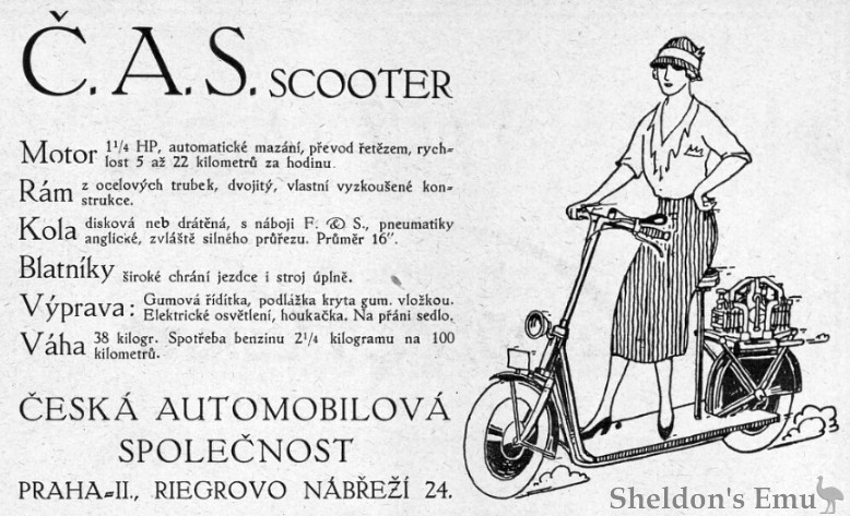Cas scooter (1921) - 180cc, 0.9 kW, 35 km/h max speed, weight 48 kg.