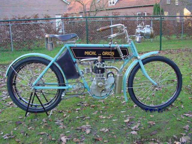 The company produced bicycles, and built its first motorcycle in 1902 badged 'Michl Orion'. Production of their quality machines ceased at the onset of war in 1914, resuming shortly after the armistice. From 1919 they built mainly two-stroke machines, including a 594cc twin which delivered 4½ h.p. which was designed for mountain riding or sidecar work. Another famed machine was a four-stroke, the 500cc OHV F58A sports model which could achieve 120 km/h - a very respectable performance in the day.