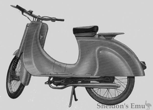 The wide footboards and full height legshields provide very complete weather protection and the screening of the engine and transmission by the all-enclosing body is absolute. There can be no trace of oil on the rider's clothes from that source.