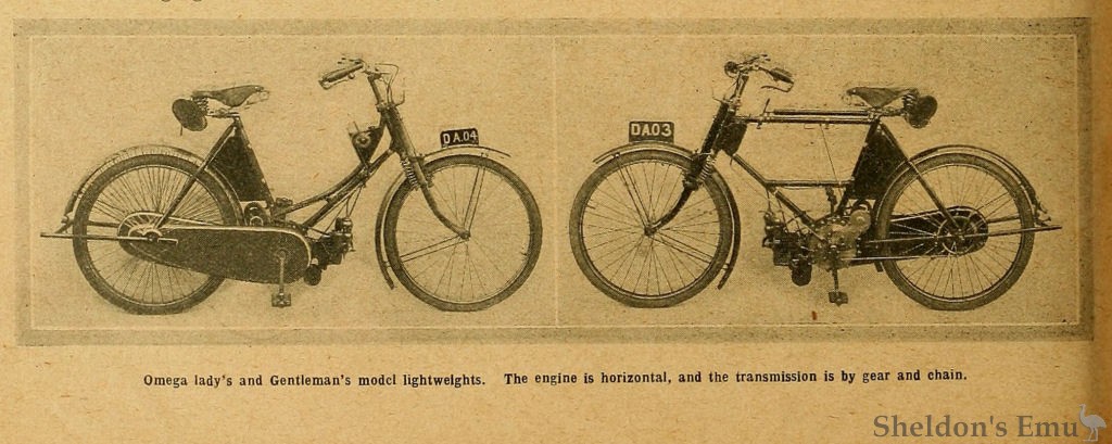 Mr. S. Dorsett, and Mr. R. S. Roberts built the Omega at their St. James' Square factory in Wolverhampton. It had a 1.5 h.p. engine horizontally mounted in a bicycle-style frame, with bicycle pedals and running gear.