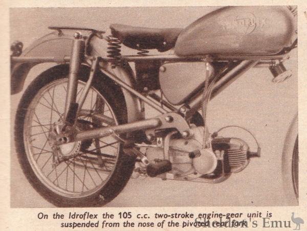 A light motorcycle was presented at the 1949 Milan Exhibition by the REOM Company (Societè per il Commercio e l'Industria Radio Elettrica Ottica Meccanica). Built for them by the Marzocchi brothers, the machine has a horizontal unit-construction single-cylinder engine of 105cc, three-speed transmission, with the engine cantilevered in a fashion somewhat similar to the German Imme. The front forks are telescopic and the rear swingarm has hydraulic shock absorbers. The 4.5 h.p. two-stroke engine affords a top speed of 75 km/h.