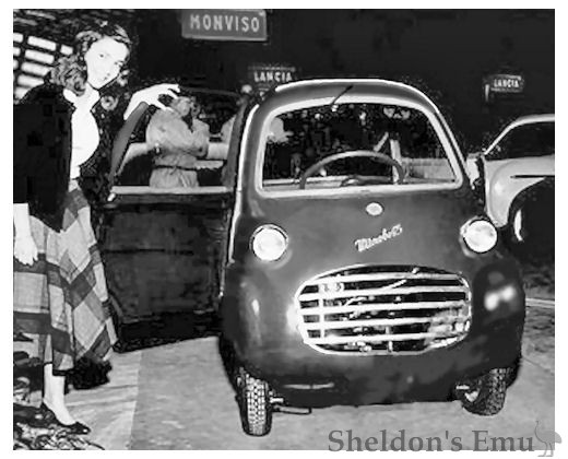 Using the same engine, at the 1953 Turin Salon they presented the 125cc Microbo tandem two-seater three-wheel microcar. Designed by Ezio Cingolani, the alloy-bodied beauty did not enter series production. Photographs of at least four different styles exist, including the quite sporty predecessor of 1952 built by Cingolani, and it is thought that perhaps as many as twelve were constructed.