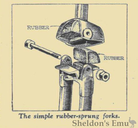 A cycle-type frame is employed, but all the tubes and lugs are of tandem strength. Rubber cushioned front forks allow the front-wheel spindle a movement of 3/4 in.; the single pivot pin is fixed in the fork ends and free to rotate in the bottom steering head lug. Lubrication is carried out from the top of the steering column.