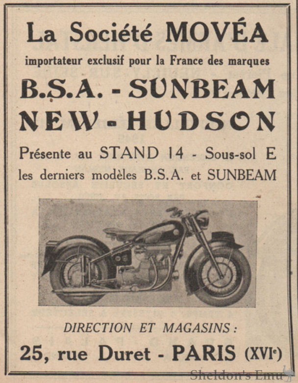 L'agent général pour la France de B.S.A. présente les différents modèles de la grande marque, parmi lesquels la nouvelle 500 cmc. deux cylindres verticaux sera particulièrement entourée. Une autre solution du bicylindre est celle de la Sunbeam avec son moteur en ligne. Cette machine, de conception originale avec son bloc, sa fourche télescopique et ses pneus de forte section, a fait sensation partout où elle a été exposée. Il en circule quelques rares exemplaires en France, aux mains de privilégiés qui ne cachent pas leur absolue satisfaction de cette machine souple, silencieuse, très maniable malgré son apparence imposante et d'un fini sans critique.