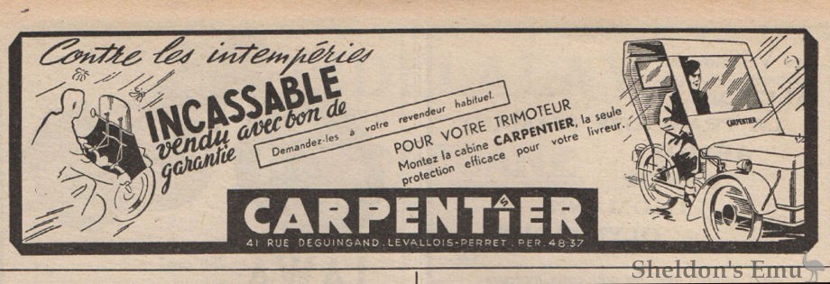There is also a Henri Carpio Sidecars of Romainville, Paris, founded 1920 according to their advertising, they are believed to have been sidecar manufacturers from 1932 to 1953. Some of their sidecars are said to be very similar to the Bernardet. Models include the Carpio GT of 1933.