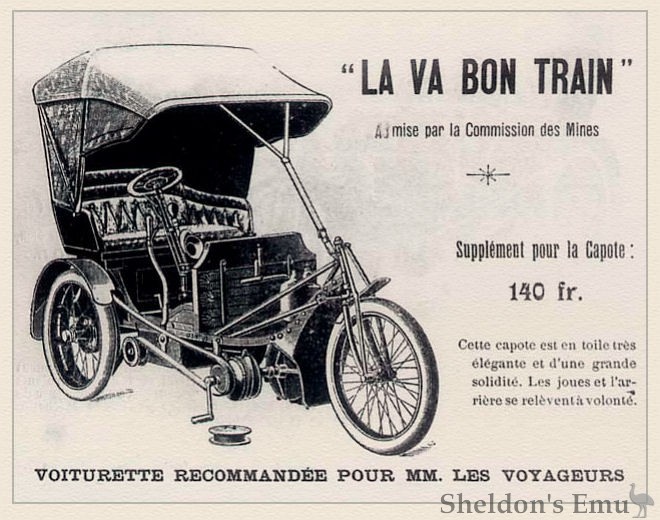 Larroumet and Lagarde of Agen, Lot-et-Garonne was founded in 1891 as a bicycle maker. Their first motor-tricycles appeared in 1900. Powered by a De Dion engine, the two-seater had a retractable hood. It was built in the same town as the La Nef.
