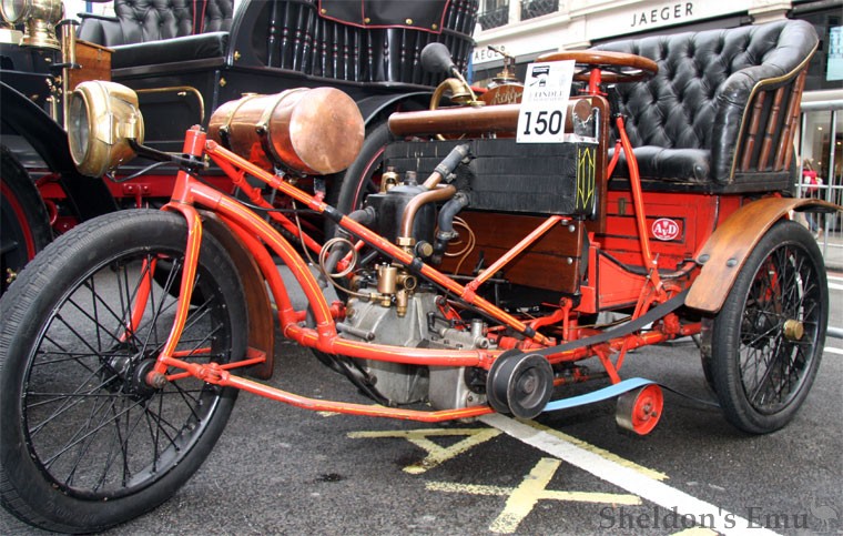 The engine is positioned just behind the front wheel with belt drive to the rear wheels.