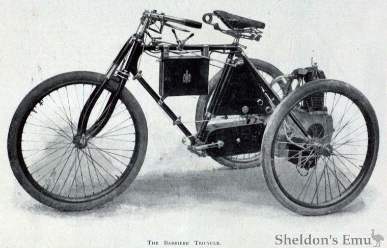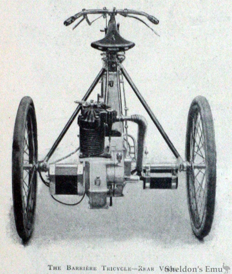 Among the motor cycles a novelty will be found in the Barriere sociable. This is built on the same system as the Barriere tricycle, which has already been fully described in our pages, but two saddles are fitted side by side with a long adjustable handle-bar in front. By mutual arrangement either rider can steer or drive, whilst comfortable footrests of respectable dimensions are fitted. This should meet the views of those who object to trailers or tandems.