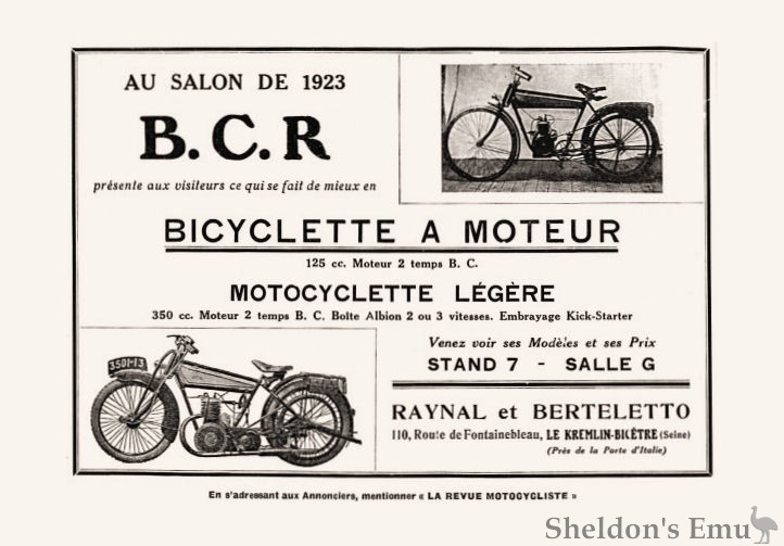 Their workshops produced motorcycles with sprung frames from 1923. These used the BC engines, along with those of JAP (250 to 500cc, SV & OHV) and Chaise. The BCR firm was acquired by Poinard in 1929, and it appears that M. Raynal was still associated with that firm into the 1950s.