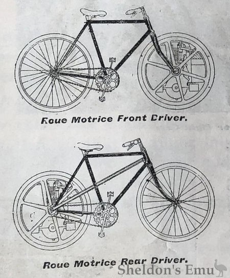 The "ROUE MOTRICE" machine is the invention of G. Boivin, 14, Rue Girardon, Paris. It bears a striking likeness to the English Singer motor-bicycle, inasmuch as the motor, carburetter, etc., are contained within the wheel. The wheel axle is driven by means of reduction gearing from the motor shaft. Two patterns are made, one with the motor in the front wheel, and the other in the rear wheel. The controlling the motor speed is effected by two levers mounted on the handlebar, and connecting with the motor through a hollow axle.