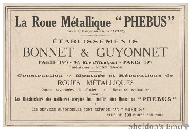M. Canonne had also been involved with the firm, it appears, and left on Christmas Day in 1910. The firm at that time were still building motorcycles. An advertisement appeared in September 1918 "Automobilia" for La Roue Métalliques "PHEBUS" (metal wheels). They also built the Daring motorcycle.