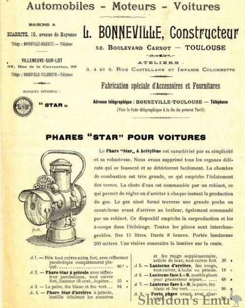 The Bonneville firm also marketed Star acetylene lamps, Phares "Star" Pour Voitures.