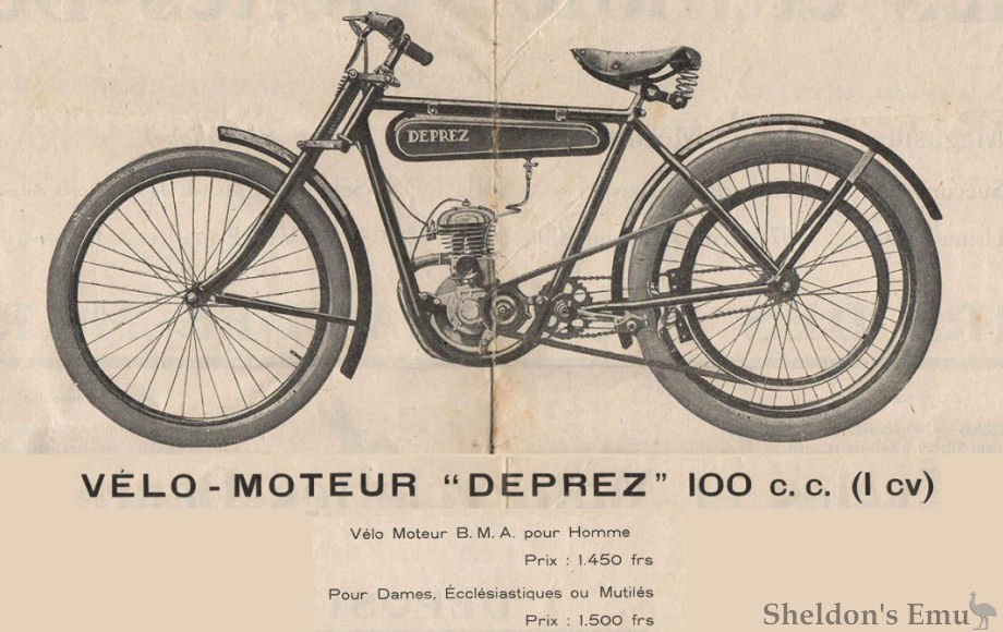 The firm was still operating in 1937 at the Courbevoie address, offering motorcycles from Terrot, Peugeot, Automoto and others, along with sidecars from Vannod, Bufflier and Bernardet. Their catalogue was extensive (80 pages) and included leather apparel, sparkplugs, speedometers, lights, levers, tyres, hub brakes and racks along with a variety of Deprez bicycles. They were no longer offering motorcycles with their own brand.