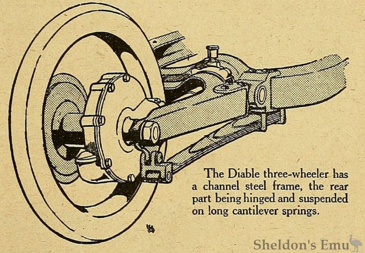 The Diable three-wheeler has a channel steel frame, the rear part being hinged and suspended on long cantilever springs.