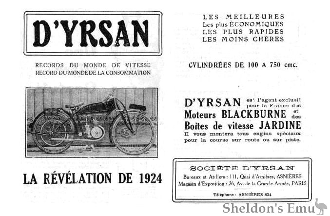Moto Revue Number 167, 1st March 1925, contains an article on D'yrsan motocyclettes.