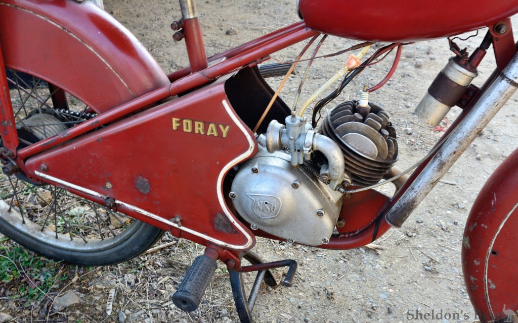 Probably built in the 1950s, it has an NSU engine and bears the Sovexia brand on the forks, and the FORAY name painted on the bodywork (and possibly stamped on the frame).
