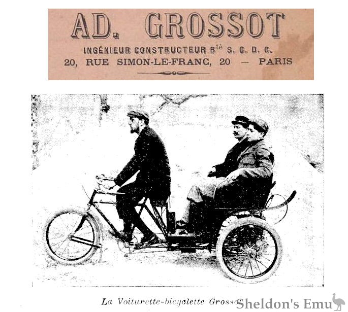 AD. Grossot of 20 Rue Simon-Le-Franc, Paris, was well-known for his bicycles which included a seven-seater. Around 1899 he built a tricycle powered by a Sphinx engine.
