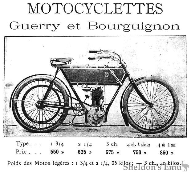 A later catalogue (thought to be 1906) offers machines from Guerry et Bourguignon with engines of 1 3/4, 2 1/4, 3 and 4 ch. at prices of 550 to 850 francs.