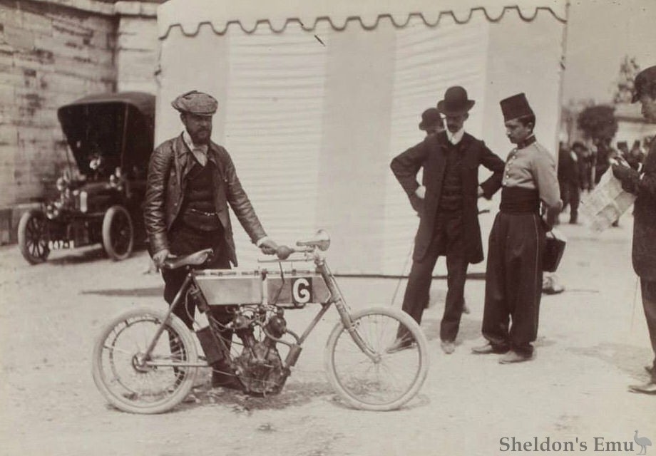 Francois Fernand Haustgen patent GB190223658A: Improvements in Clutch Mechanism for Explosion Motors Principally Intended for Motor Cycles, published Feb 1903.