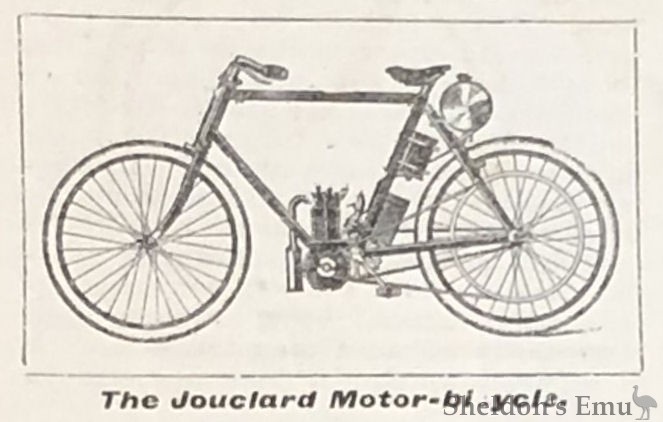 G. Jouclard, Dijon, shows several particularly neat and well-finished motor-bicycles. They have the merit of lightness, being only 66lbs. weight complete. The motor develops 1½ b.h.p., and has a bore of 63 mm., and stroke of 65 mm. Transmission of power is by round belt. The frame is specially designed, and the motor is clamped to a bridge piece between the bracket and down tube, and placed in a vertical position. The ignition is by coil and accumulator, these being carried behind the diagonal tube. Petrol tank is placed on the rear forks. A special form of spray carburetter is used. Two brakes are fitted - a Bowden rim brake for back wheel, and tyre brake for front. Speed is controlled by advancing or retarding the ignition. The machine is claimed to be equal to a speed of 25 miles an hour. Price comes out at £ 30 only.