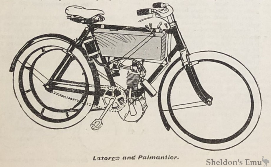 Laforge and Palmantier Freres, 33, Avenue de Wagram, Paris, make a speciality of a 2 h.p. motor-bicycle possessing some special features. The motor is placed vertically in front of the crank bracket, and is supported in a very rigid manner, the crank case and cylinder being bolted to a circular bridge piece at the end of the main tube, and also supported by a short extension piece at the bracket. The carburetter is a special form of spray. Ignition by coil and accumulator, the coil being clipped behind the diagonal. Two very good rim brakes are fitted, the rear one being a Bowden, and the front a pull-up lever. A pump lubrication system is used, and the speed of motor is controlled by spark advance and throttle. Drive is by means of a flat belt. Price £34.