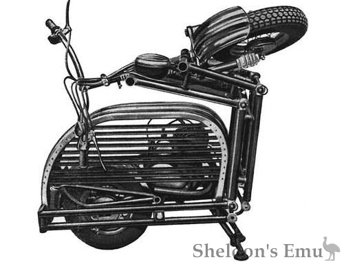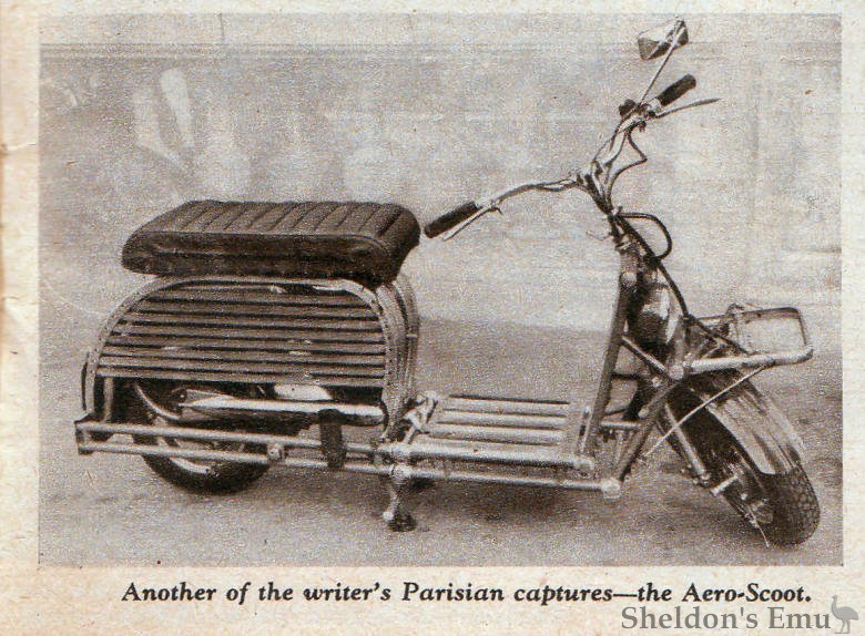 Lefol also marketed the Aero-Scoot, a very similar machine propelled by a 98cc Sachs engine presented at the 1953 Salon. The Aero-scoot could be either folded, or dismantled into several sections for more compact storage. Both versions were advertised as suitable for carriage in the trunk of an automobile, or, for the more well-to-do, aboard a yacht or in a light aeroplane.