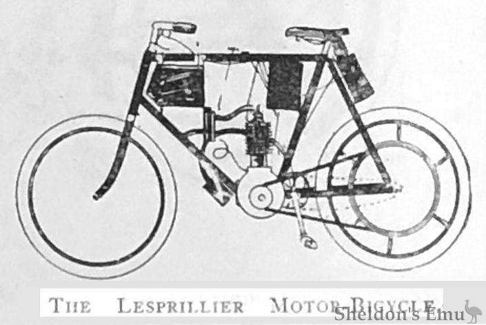 The Lesprillier Motor-Bicycle. - This machine has a 2¾ h.p. motor placed vertically between the main tube and diagonal. It drives by means of a round belt. The carburetter is a spray type fed from a petrol tank, placed in the fore part of the machine. The coil for ignition is placed in front of the diagonal, and the accumulator is strapped on the back forks. Regulation of speed is effected by spark advance and throttle valve. The weight comes out at about 100lbs., and price £37. The depot for this machine is 22, Avenue d'ltalie, Paris.