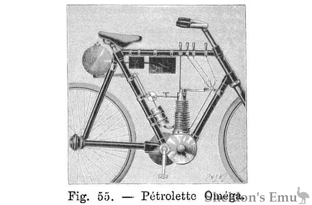 Pètrolette "Oméga". Ce modèle dû à M. Bergeron, et que représente la fig. 55, est muni d’un moteur disposé audessus du pédalier et dont le mouvement de rotation est transmis à la roue d’arrière par un double train d’engrenages d’angle, comme dans les bicyclettes du type cc Àcatène ». Il n’y a pas de carburateur, mais un appareil de distribution le remplaçant. Ce système n’ayant pas reçu la sanction de la pratique, nous n’insisterons donc pas sur les avantages qu’il peut posséder, et que nous ignorons.