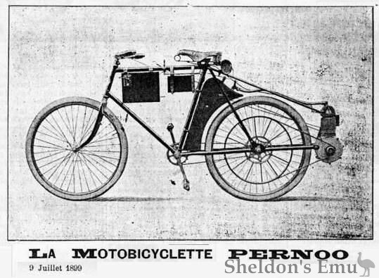 Pernoo also built motor tricycles. He had considerable experience in the field, having worked with a Rudge and Whitworth cycle dealership in Paris. (As Bourdache points out, that concession was previously held by Duncan and Suberbie who built the Hildebrand & Wolfmüller under licence.)