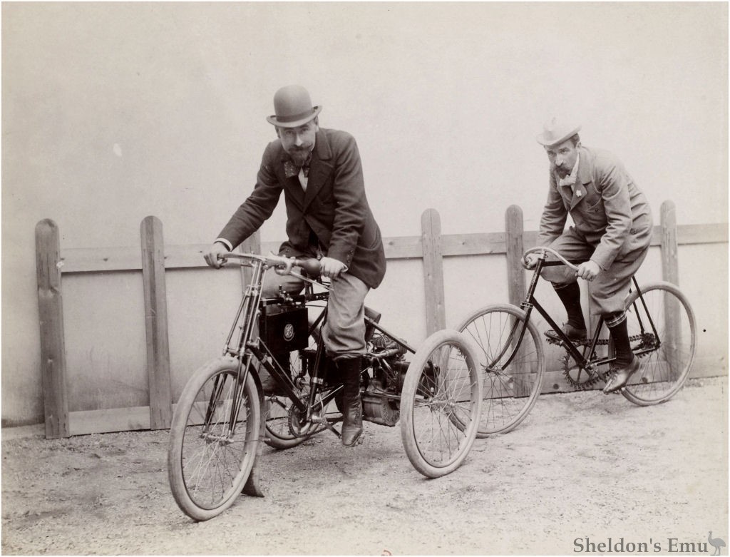 Léonce Girardot on a motor tricycle and Gaston Rivierre on a bicycle. Photograph by Jules Beau.