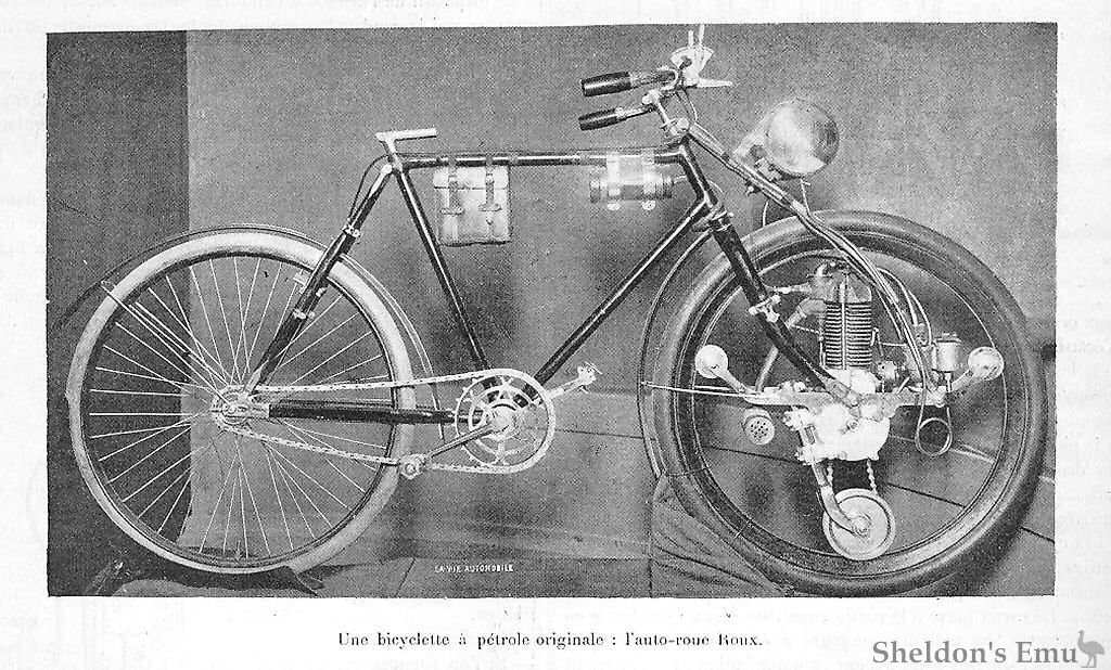 Edmond Roux and Henri Imbert registered the design for l'auto-roue Roux (The Roux Motor Wheel) in 1900, with an an addition in 1903. It is discussed in an article in "La Vie Automobile" of 1904, and it appears only one was built, powered by a single-cylinder four-stroke De Dion-Bouton engine mounted integral with the front wheel. The design had a number of flaws.