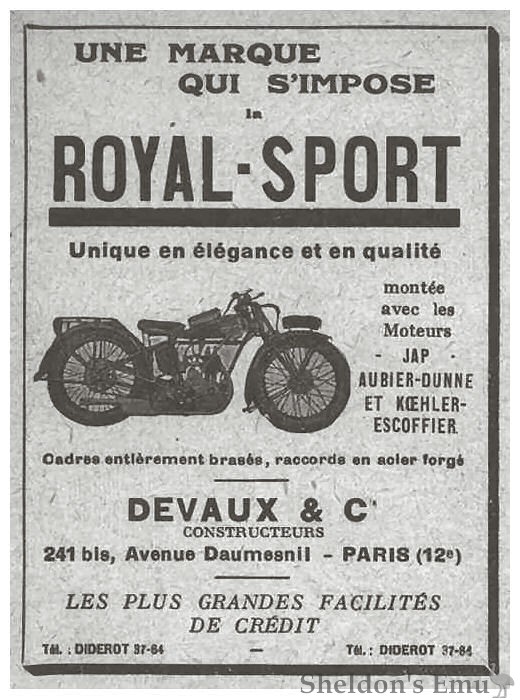 Built motorcycles using engines from Aubier & Dunn, JAP and Koehler-Escoffier. Frames were from G.A.M., who also supplied René Bancal, the makers of the France Sport, which was reportedly all but identical to the Royal Sport.
