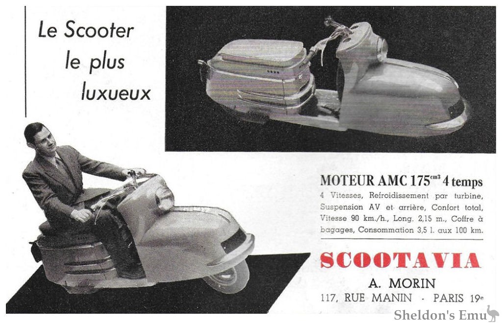 Scootavia were luxurious and innovative scooters fitted initially with Ydral engines, first advertised in 1949 with production beginning probably early in 1950. For 1951 there were design changes along with a new engine, the AMC 4-speed 175cc four-stroke. There was an association with M. Petigat, who built the scooter under licence from 1952 until end of production in 1954.