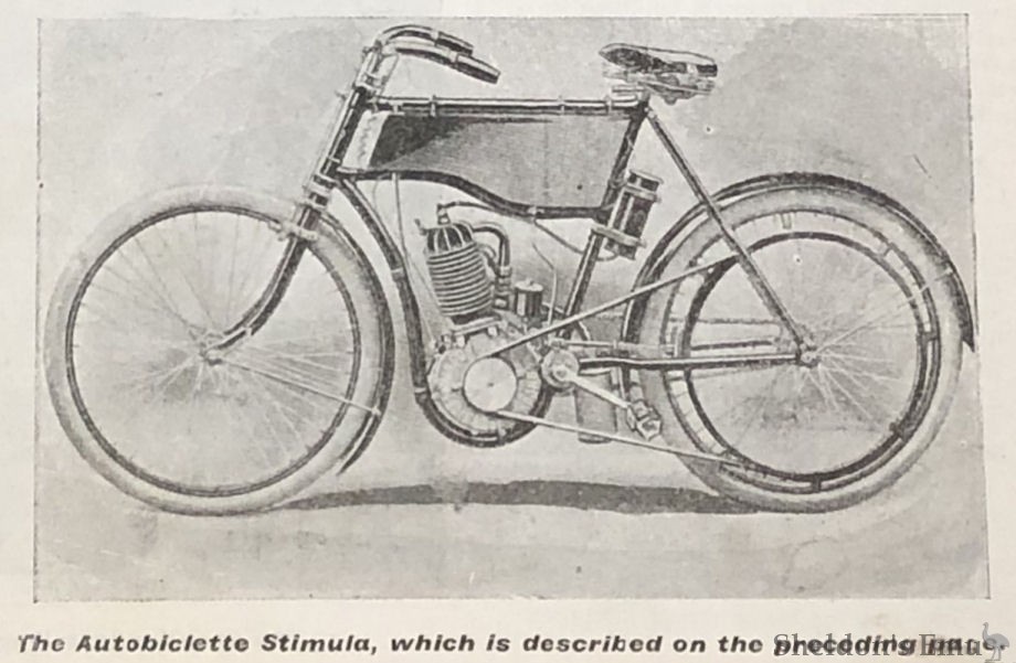 The "Stimula" auto-bicycle, made at the Ateliers de la Grosne, Saone-et-Loire, is made on lines that are fairly familiar in England. The motor is of 2 horse-power, mounted in a loop frame, with extra horizontal tube. Large radiators are a special feature. A spray carburetter and high-tension ignition are used, and the sparkplug is placed in the centre of combustion chamber. Control of speed is effected by a single lever placed just behind the head clip. The brakes are good, a back-pedalling rim brake for rear wheel, and hand-applied rim brake for front wheel being provided. The weight of the machine is 93lbs., and price £35