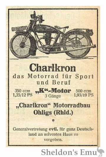 Manufactured by Charlkron Motorradbau, Hochstr. 43, Ohligs. 1925-1926