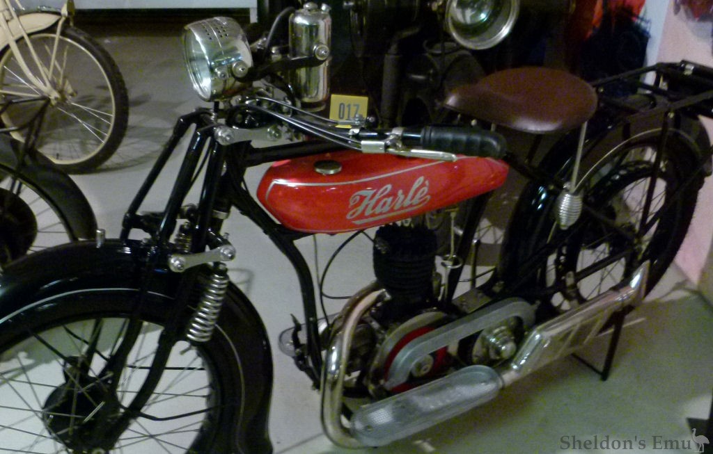 Built ca 1925-27, Harle motorcycles were mostly fitted with 350cc Bark two-stroke engines, with clutch and two-speed gearbox driving the rear wheel by belt.