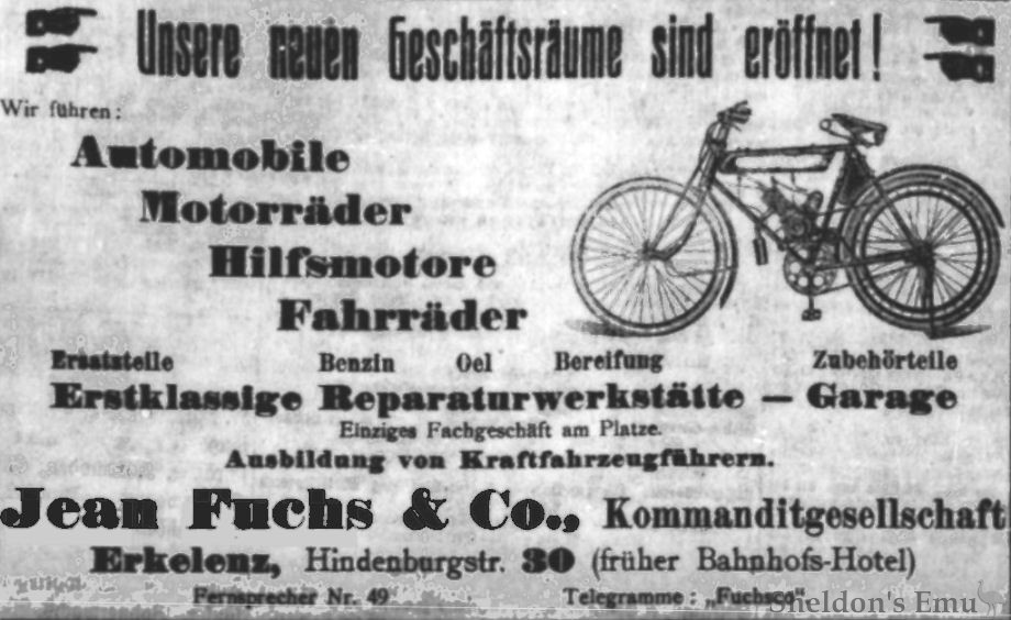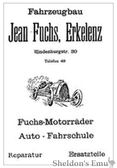 Located at Hindenburgstraße 30, Erkelenz (now Kölner Straße), in addition to building motorcycles Fuchs sold petrol and ran a driving school. He was well-known as a sporting cyclist and motorist in the 1920s.