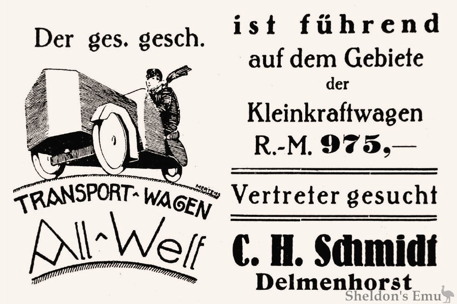 The three-wheel transport-wagen was advertised in the "Fahrrad" magazine in late 1926, seeking potential dealers. It is not known if any were actually constructed, and nothing more was heard of the machine.