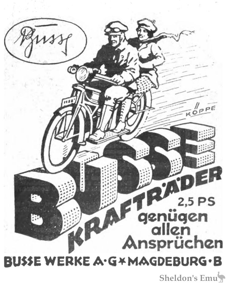 Busse Kraftfahrzeug AG of Magdeburg designed and built motorcycles with strong frames with engines of 118cc to 250cc