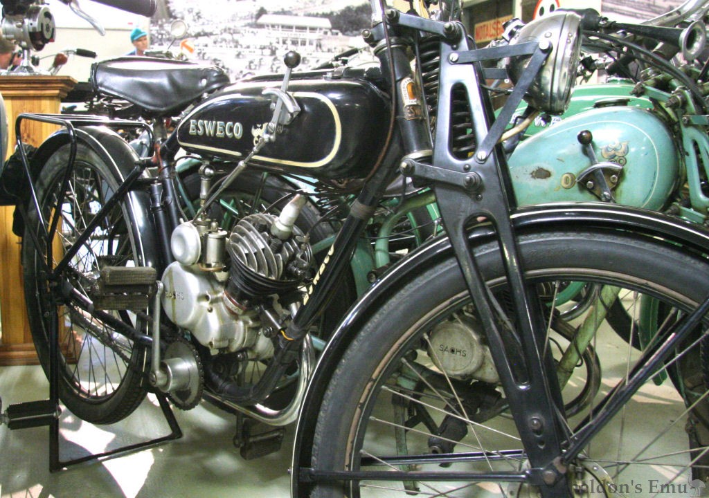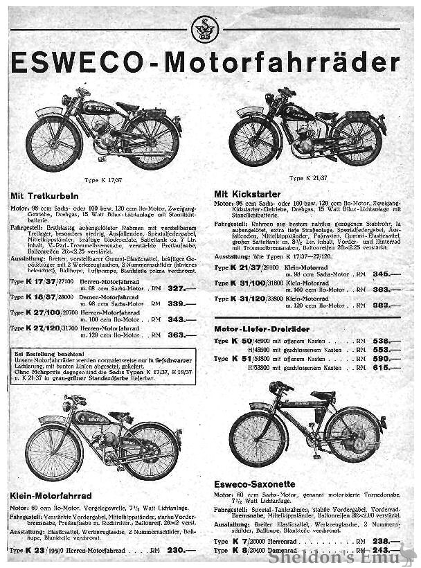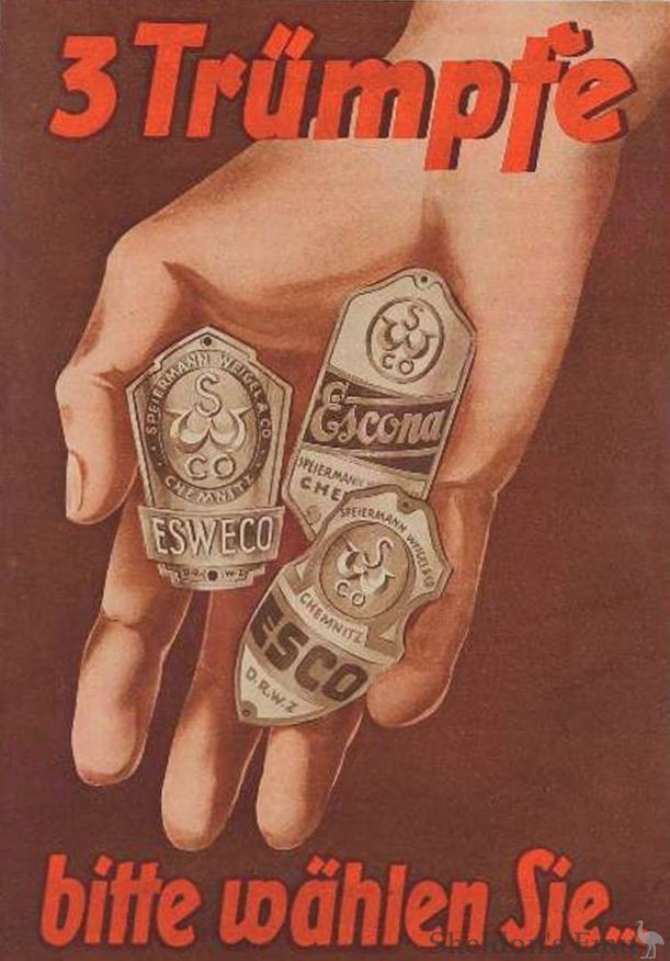 Established in 1910, manufacture of bicycles began in 1924. The firm produced the motorcycle marques Esweco, Esco and Escona. Most of their machines were motorised bicycles of 60cc and 98cc powered by Sachs engines. Their 1939 Esweco sales brochure listed motorcycles with pedals or kickstarter fitted with Sachs 98cc and JLO 120cc engines, along with a Klein-Motorfahrrad 60cc JLO and Esweco-Saxonette with the 60cc engine fitted to the rear wheel. Most models had Damenfarrad or Damen-Motorfahrad versions.