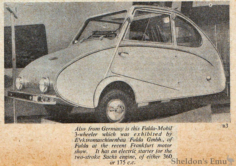 Also from Germany is this Fulda-Mobil 3-wheeler which was exhibited by Elektromaschinenbau Fulda Gmbh., of Fulda at the recent Frankfurt motor show. It has an electric starter for the two-stroke Sachs engine of either 360 or 175 c.c.