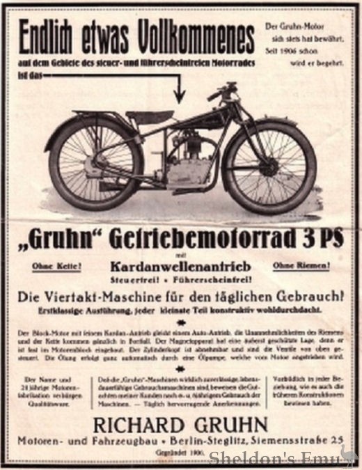 1. Richard Gruhn Motoren & Fahrzeugbau, Berlin-Steglitz was founded in 1906 and built motorcycles and engines until 1932. Gruhn built 148, 198 and 246cc two-stroke engines, and developed a 198cc ohv engine with cardan drive in 1928. His engines were fitted to ABC GmbH, AMBAG and other brands.