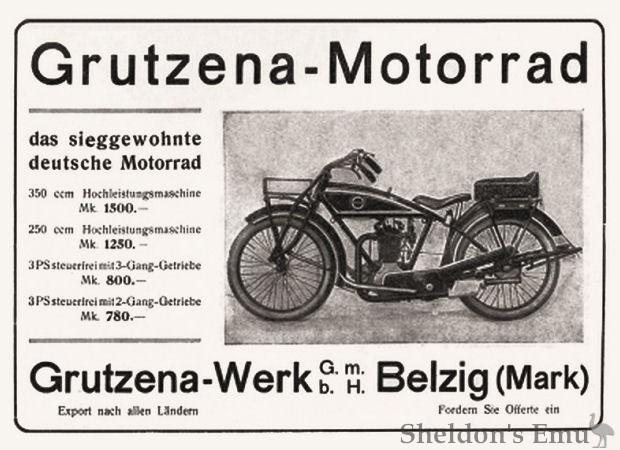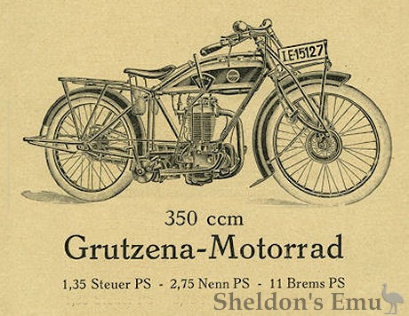 During development Grutzena motorcycles had appeared at several local sporting events with a number of podium finishes, and competed in the 1925 ADAC Deutschlandfahrt rally.