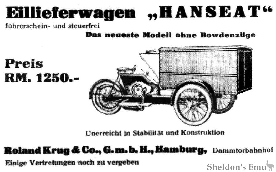 The Hanseat had a pressed steel box frame, two leaf-sprung wheels at the front and an unsprung rear wheel. It was steered with a handlebar. A front-loader, it was available with a tray or box. It had belt-drive, with engines of 198cc, 248cc or 348cc.