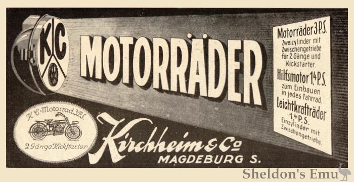 Founded by Karl Kirchheim in 1920/1921 in partnership with Ferdinand Schlegel. The company went public in 1923, but with the country ravaged by hyperinflation, the IPO failed in 1924. Schlegel left the company in October that year, and there is no further evidence of motorcycle manufacture.