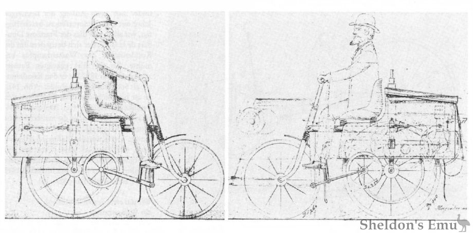 Manufactured by Wilhelm Maybach who submitted his patent some six months later than that of Bánki. His first tricycle appeared in 1886.