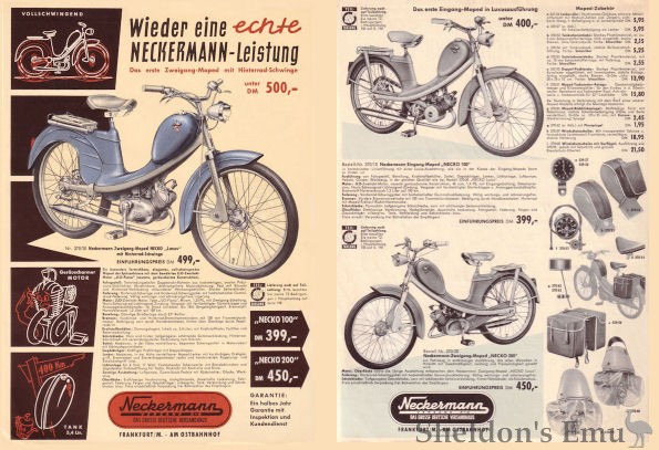 Marketed by Neckermann-Versand KG from 1954 to 1960, the Necko used JLO engines and came in three versions, the 100, the 200 and the Luxe. These were built by Geier-Werke.