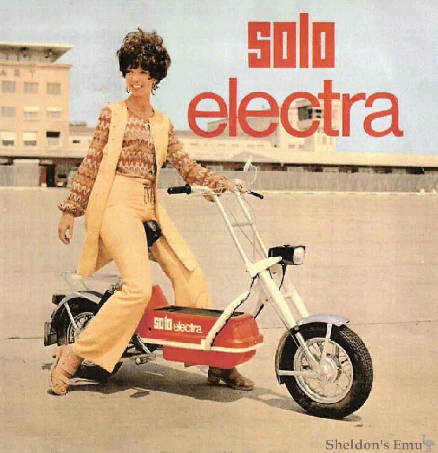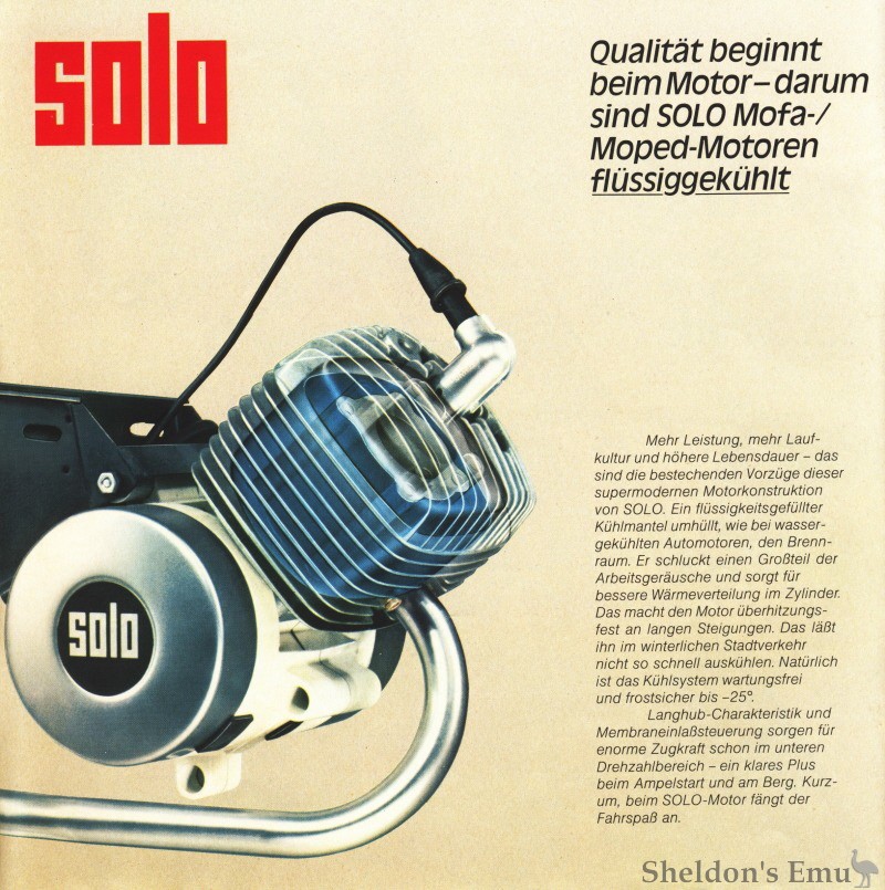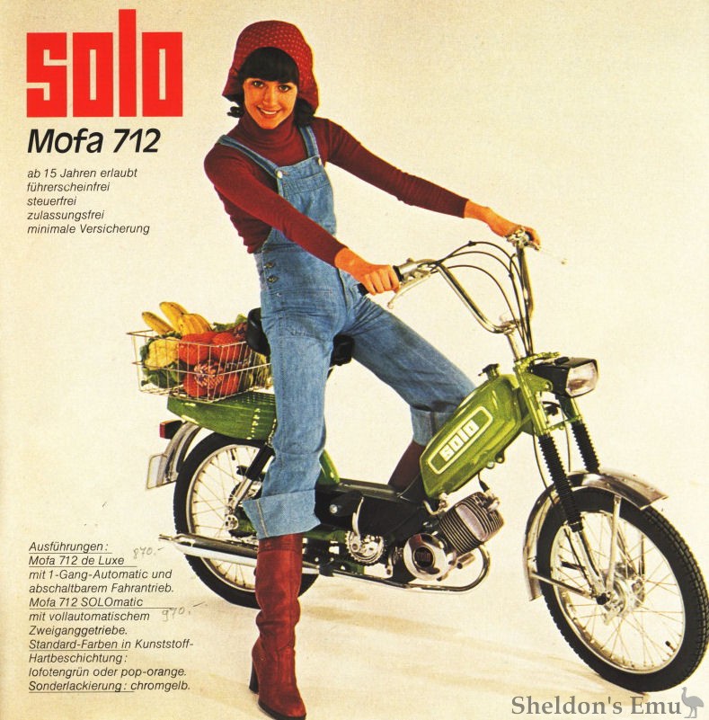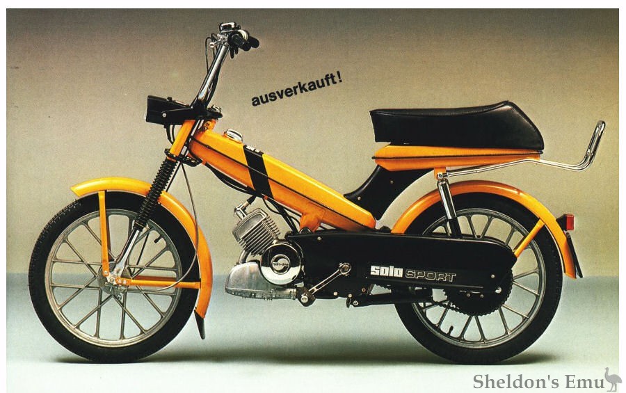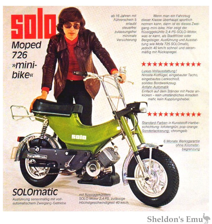 Their first moped appeared in 1971, the water-cooled Solo with 10mm Bing carburettor. The engine cylinder had a jacket containing coolant, but no radiator or water pump. A "mini-bike" Type 726 arrived in 1975, using the same water-jacket 50cc engine. A rather amusing account of this model may be found at icenicam.org.uk - "Solo's wavering VDO speedo did manage to indicate a surprisingly reasonable approximation of actual speed."