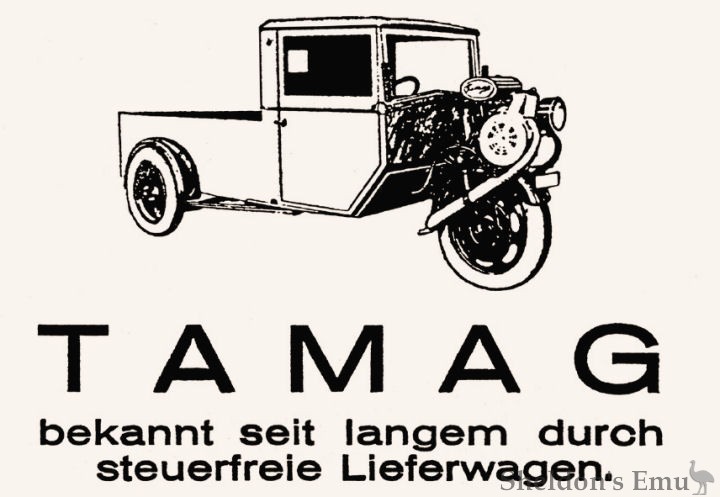 Displayed at the Berlin auto show of 1933 was a Lastendreiräder (cargo tricycle) with a 750kg payload powered by 200cc two-stroke engines from JLO and DKW. Other models of up to 600cc were constructed, some with water-cooled engines, and large trailers could be fitted to some models. Most had the engine mounted above the front wheel.